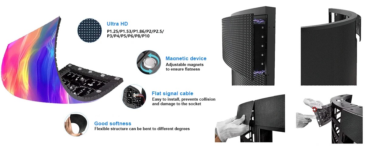 Characterized by its pliable structure and capacity for custom-shaped configurations, this display offers exceptional versatility. It can be gracefully curved, artfully folded, or seamlessly assembled to conform to diverse spatial dimensions and architectural forms. This inherent flexibility not only streamlines installation and reduces associated costs but also unlocks boundless creative possibilities for truly personalized applications.